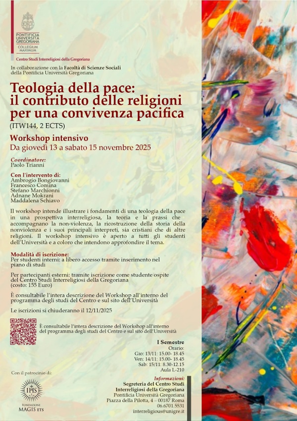 Presso l’Università Gregoriana (Piazza della Pilotta, 4, Roma) dal 13 al 15 novembre si terrà un workshop su “Teologia della pace: il contributo delle religioni per una convivenza pacifica”. La tre giorni, organizzata dal Centro Studi Interreligiosi, Facoltà di Scienze Sociali, è patrocinata anche dalla Fondazione Magis. Il workshop intende illustrare i fondamenti di una teologia della pace in una prospettiva interreligiosa, la teoria e la prassi che accompagnano la non-violenza, la ricostruzione della storia della non violenza e i suoi principali interpreti, sia cristiani che di altre religioni. Il workshop intensivo è aperto a tutti gli studenti dell’Università e a coloro che intendono approfondire il tema.