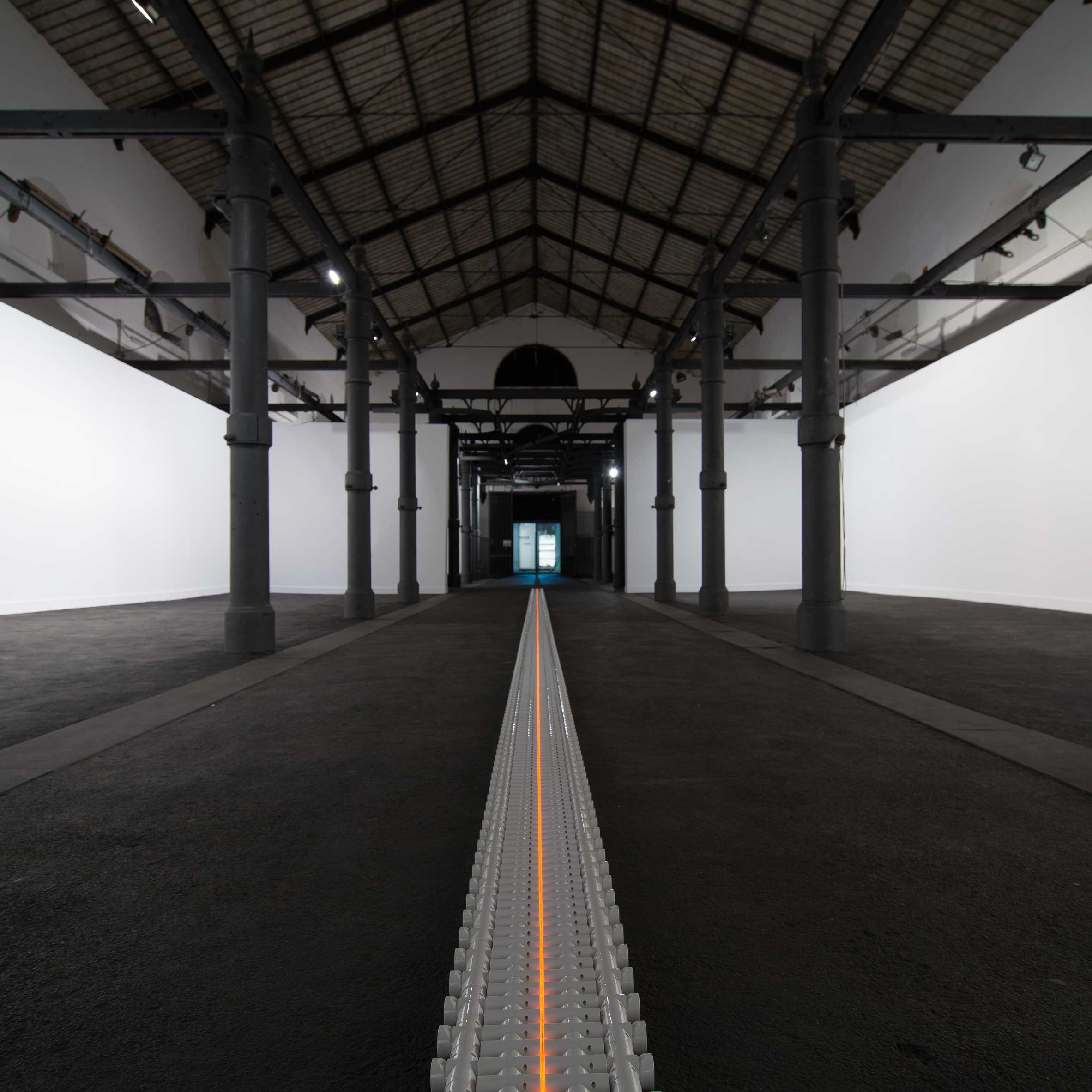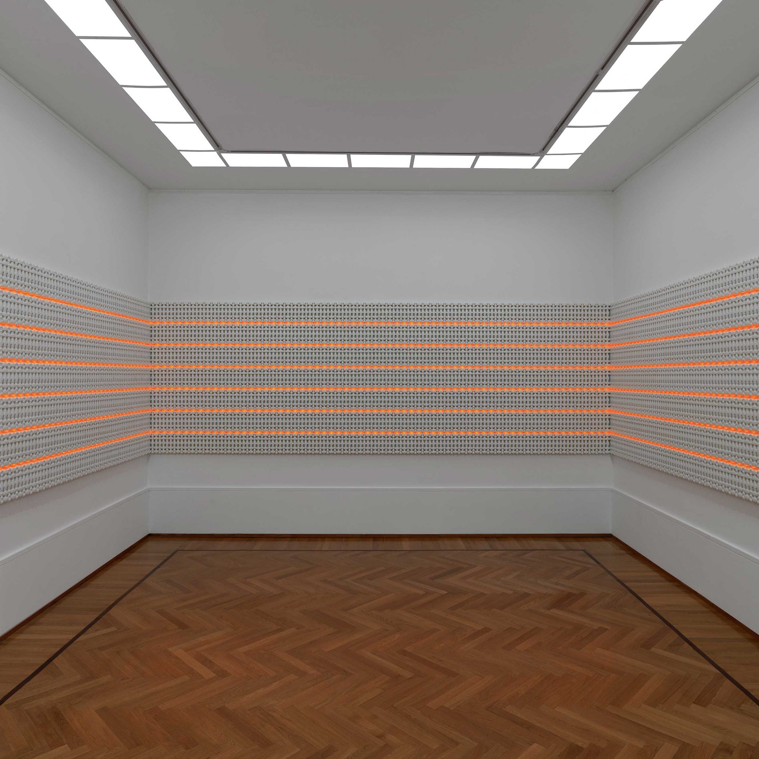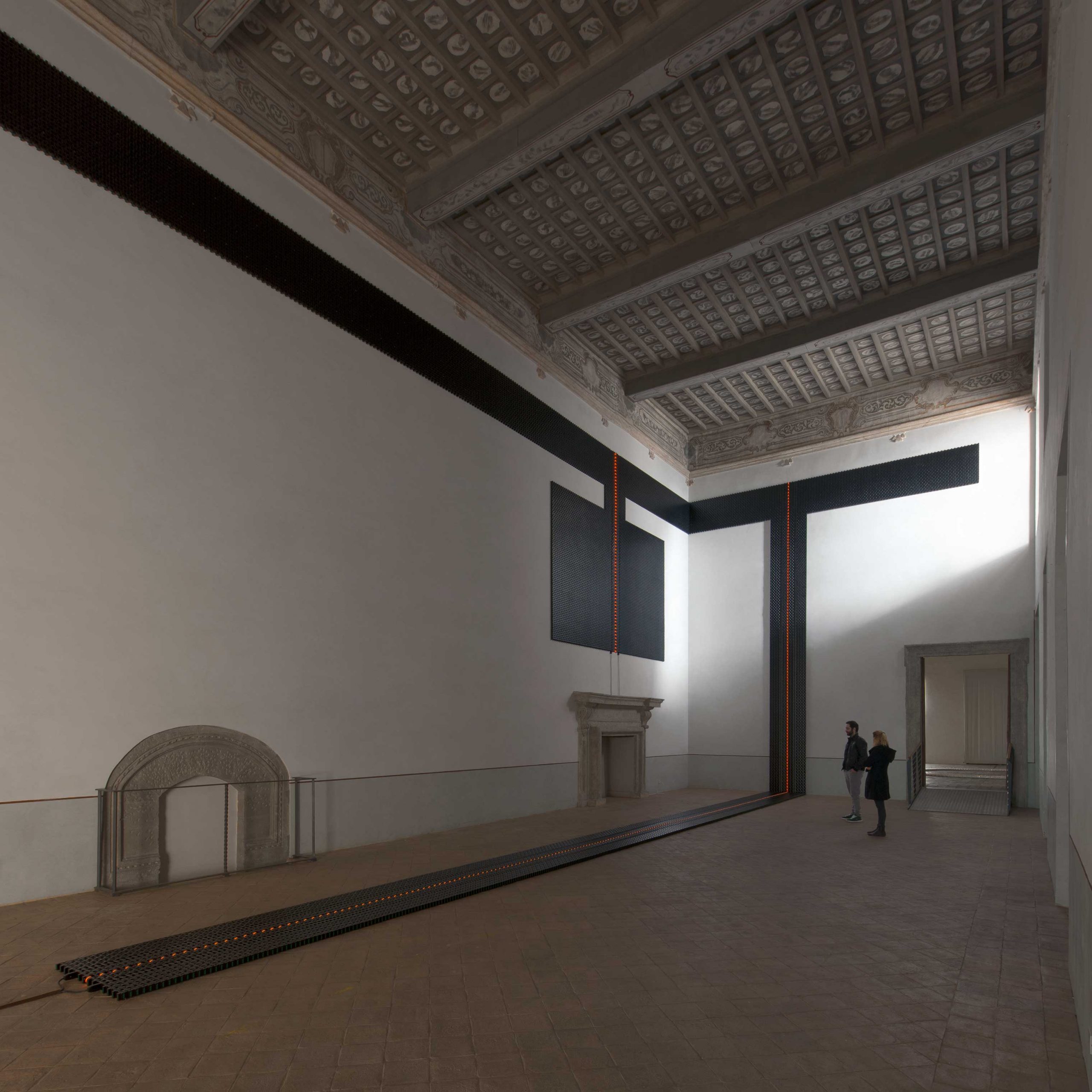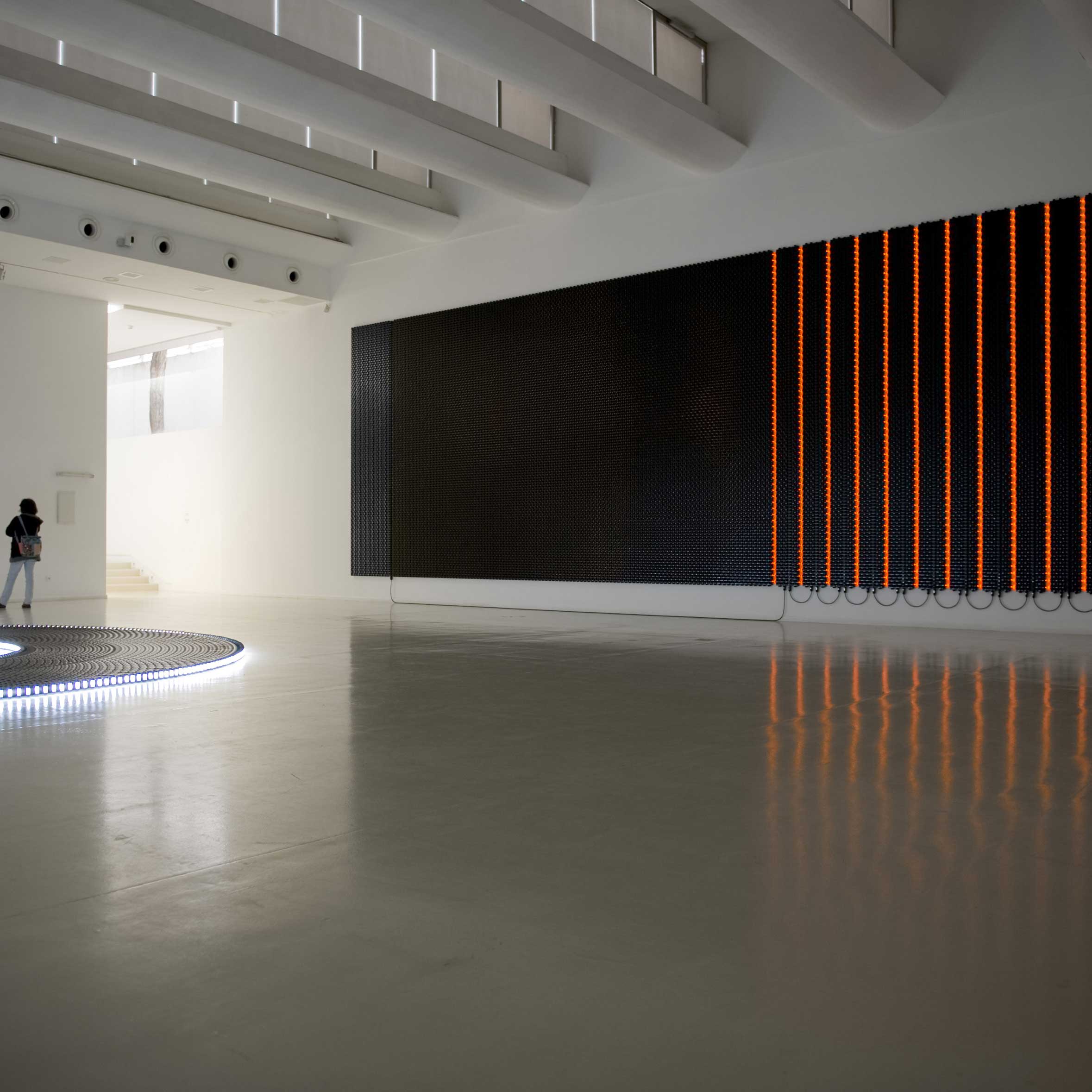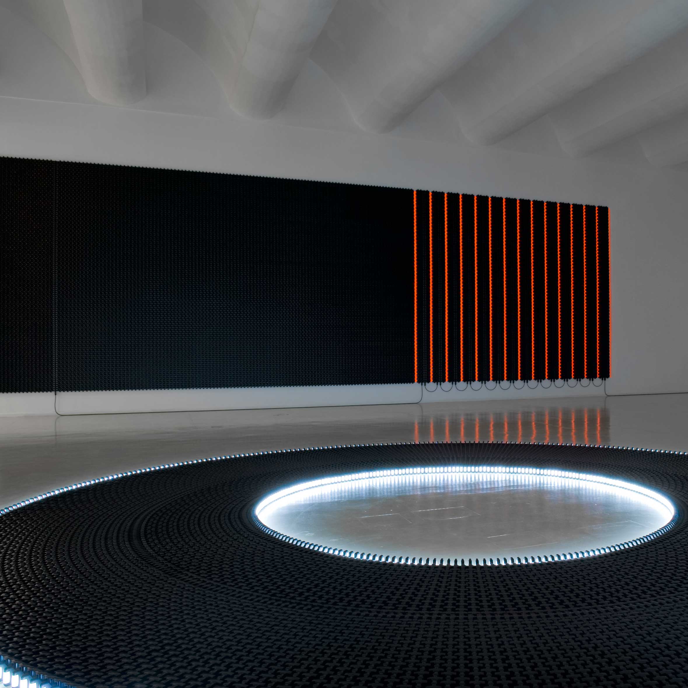 Per l’esposizione milanese è stato invitato un artista israeliano, Shay Frisch, il cui lavoro si fonda sulla trasmissione dell’energia che genera la luce. Grazie a essa, migliaia di elementi modulari conduttori d’elettricità – 37.586 moduli -, come quadrati, rettangoli, linee, croci, cerchi, danno forma a simboli ancestrali dalle forme primarie o a spazi avvolgenti, creando un reale magnetismo e un’intensa attrazione. Shay Frisch delinea un percorso fatto di campi elettromagnetici, di flussi energetici. La luce si rivela grazie alle spie luminose delle prese multiple che ne denunciano il flusso costante, inafferrabile, indefinibile. L’invisibile si fa luce.