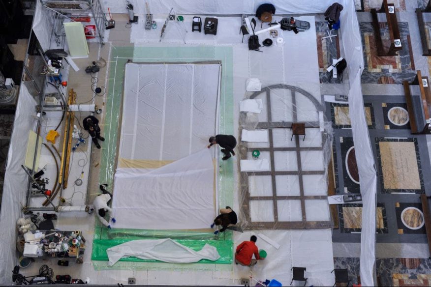 Il restauro, iniziato a giugno del 2021, ha visto impegnati diverse figure professionali non solo in complesse ed articolate operazioni di recupero della conservazione pittorica dell’opera, ma anche nella coordinazione delle movimentazioni del dipinto dalle dimensioni di circa 15 mq e dal peso complessivo di circa 300 kg.